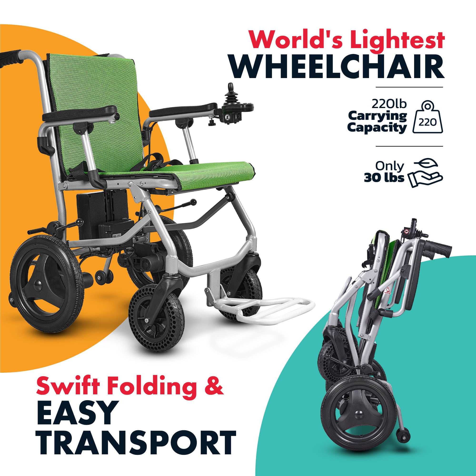Rubicon DX04, the world's lightest electric power wheelchair, is a portable, compact, and folding mobility solution for seniors and disabled adults. Weighing only 30 lbs, it folds in seconds, features dual motors, a 10-mile range, and an airline-approved battery, making this motorized electric wheelchair ideal for travel and easy transport.