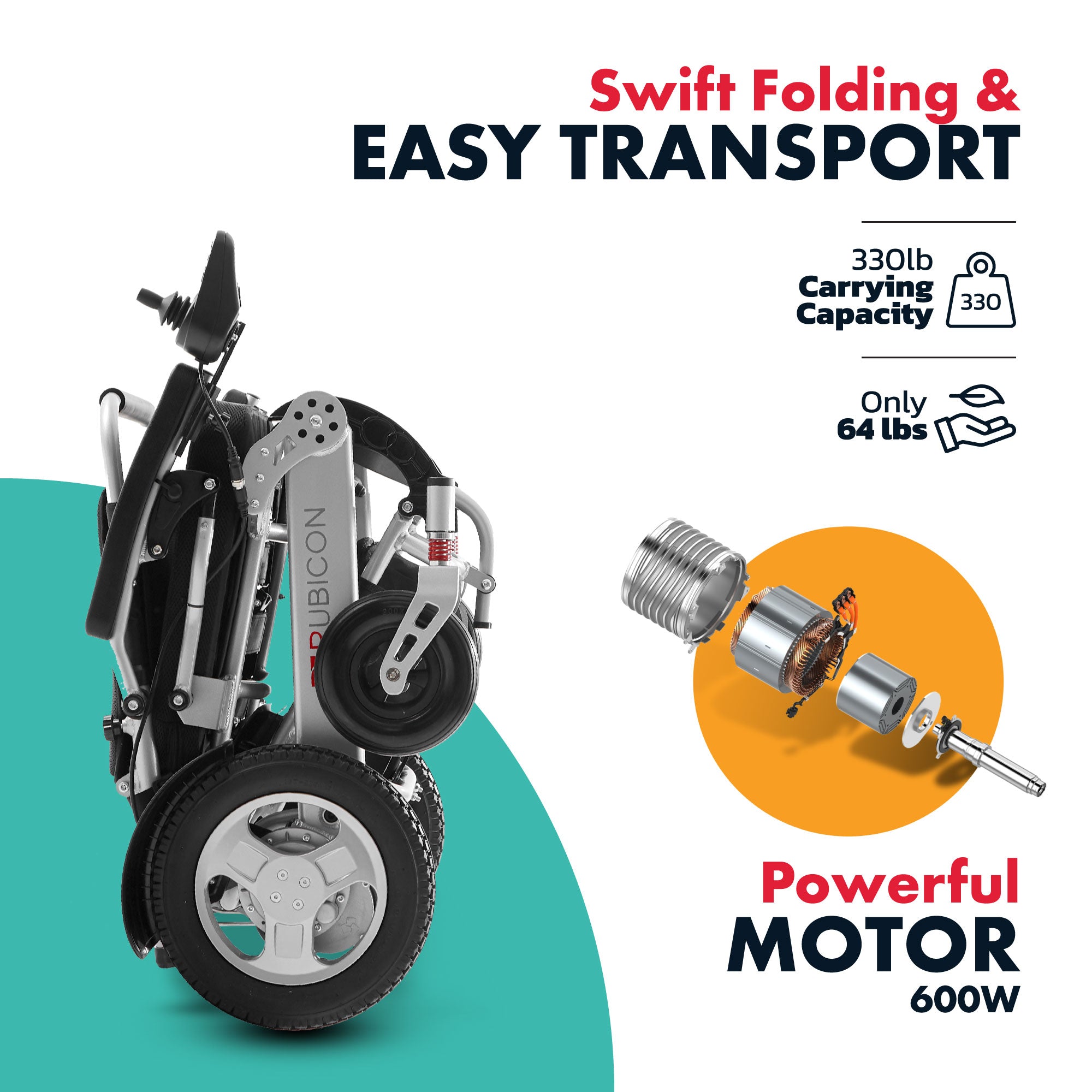 Engineered with power, comfort, and convenience in mind, the Rubicon DX12 redefines premium mobility. This deluxe electric wheelchair combines a lightweight, foldable design with high-end features like dual brushless motors and a weatherproof frame, making it ideal for both indoor and outdoor use. The DX12's compact fold allows it to fit seamlessly into car trunks, enabling effortless travel. With a robust 330 lbs weight capacity, this wheelchair offers a safe and reliable mobility solution, perfect for seniors and disabled adults who value independence and ease of use.